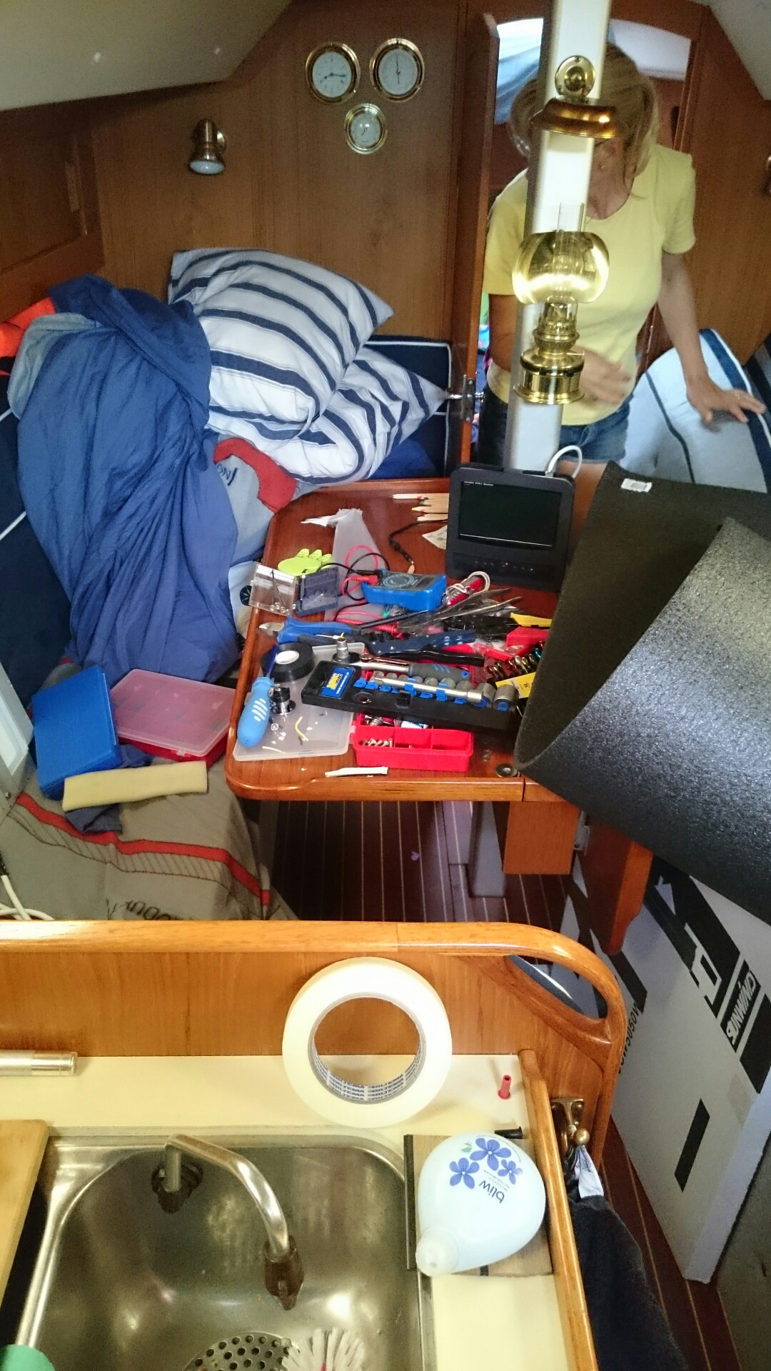 Äntligen sitter solpanelen där den ska. Kabeldragning och montage av regulator vände visst upp-och-ner på hela båten. Tur man har en bra nedgångstrappa och tålmodig familj. Det regnade vid lunchtid så måltiden intogs i trappan..