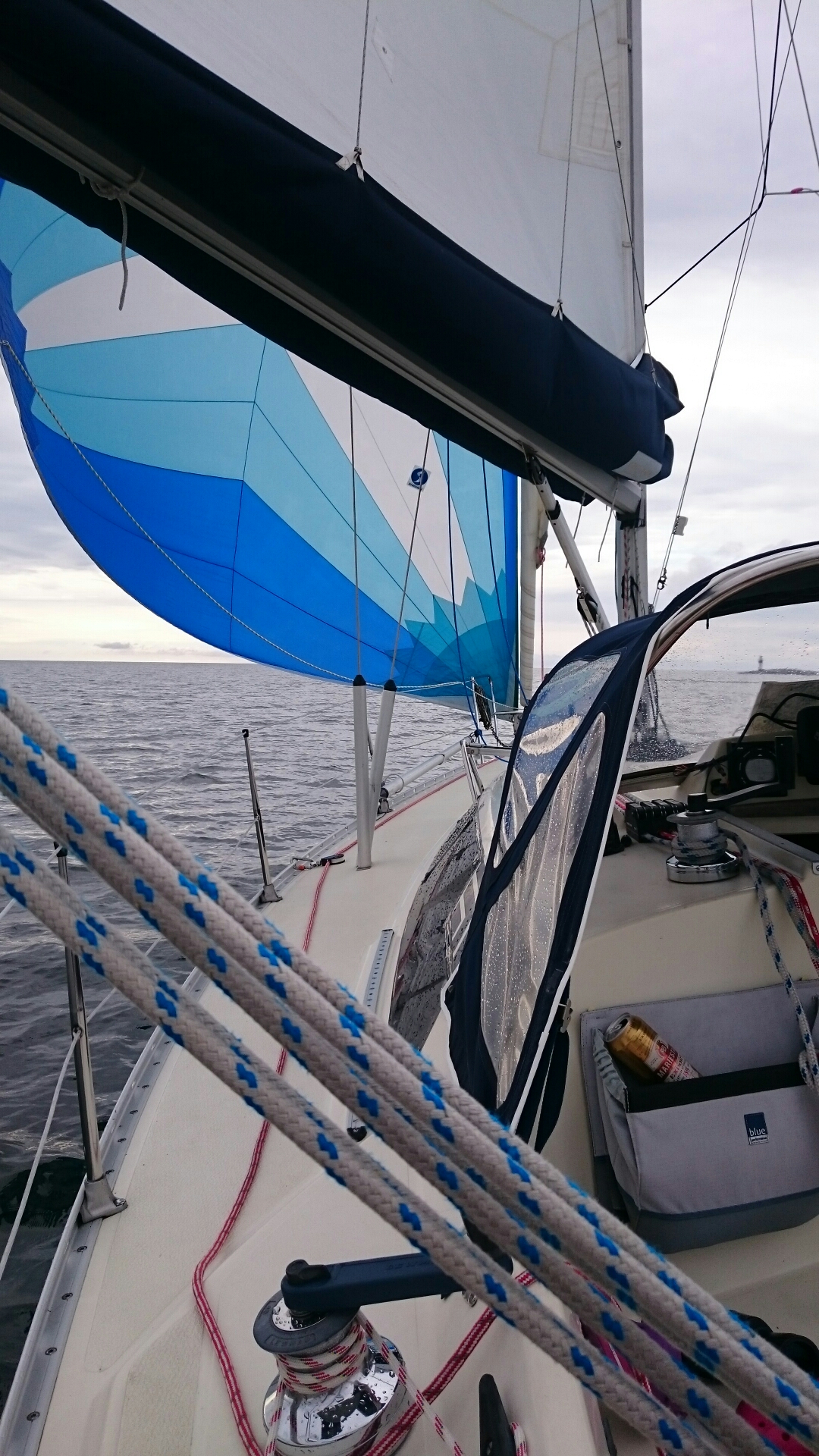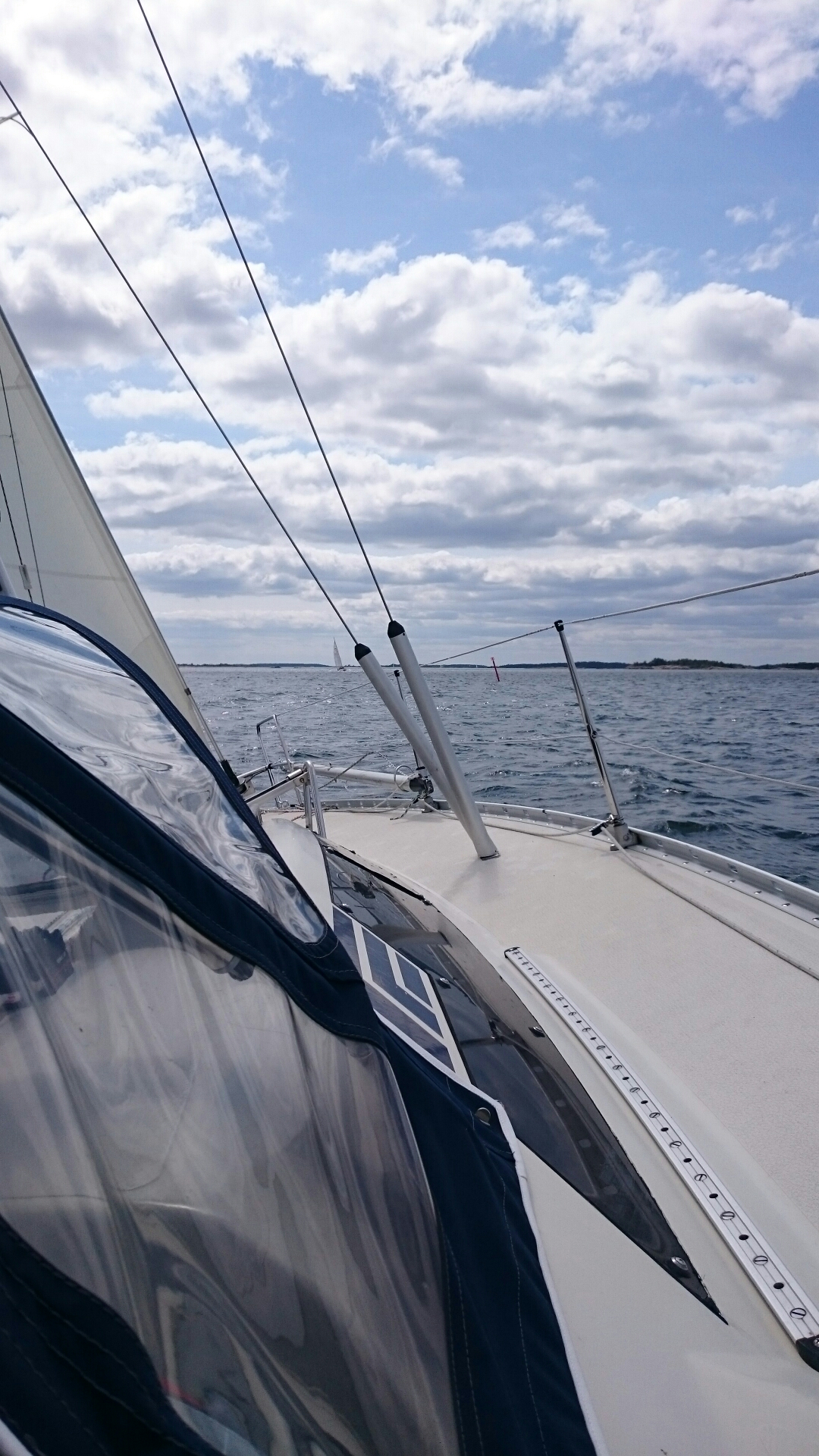 Det var tänkt att bli en fin halvvind att glida på men blev istället spetsigt och byigt. På slutet blev det säkert ett 10-tal krysslag också. Väldigt skönt när man lägger sig i lä efter en sådan här dag.