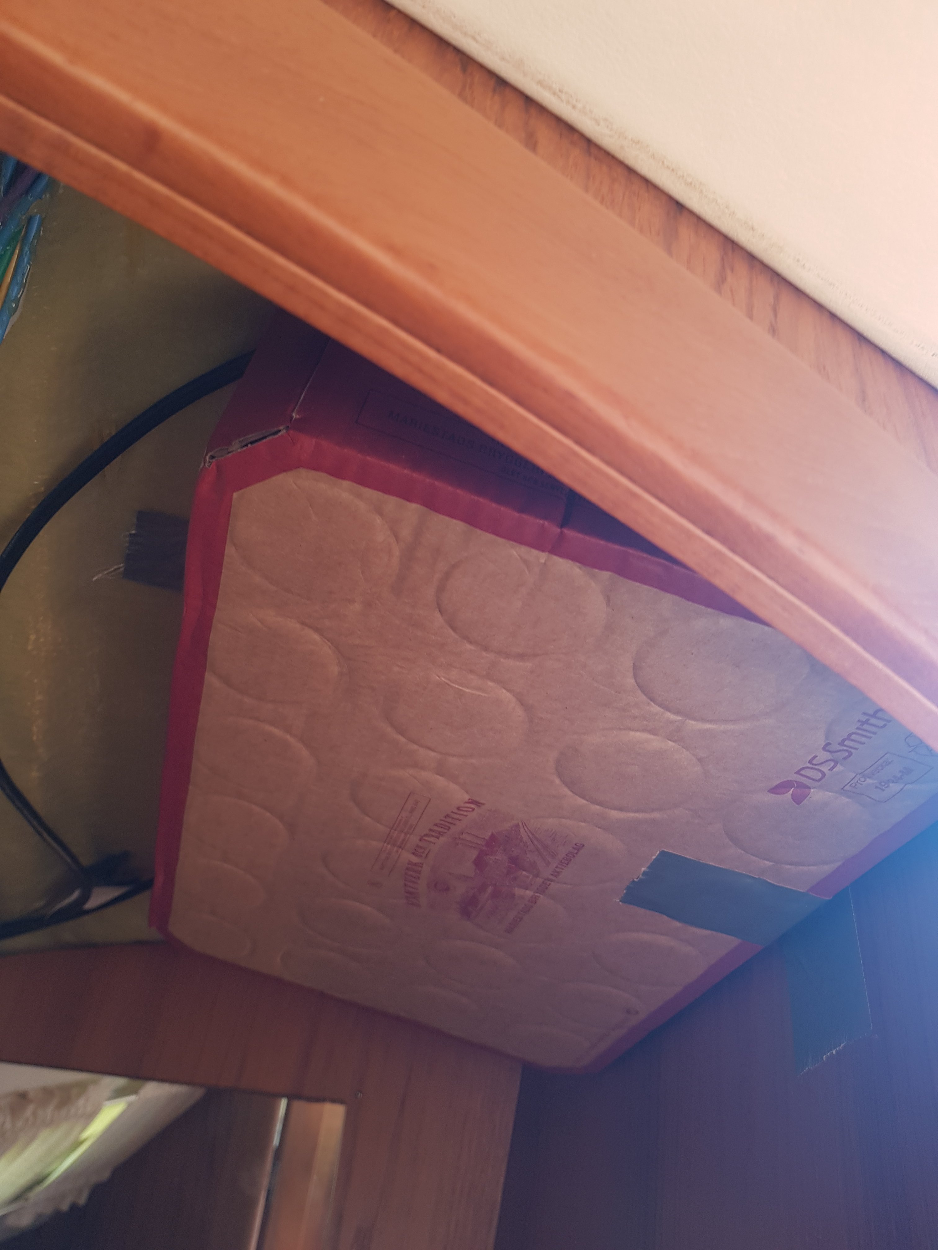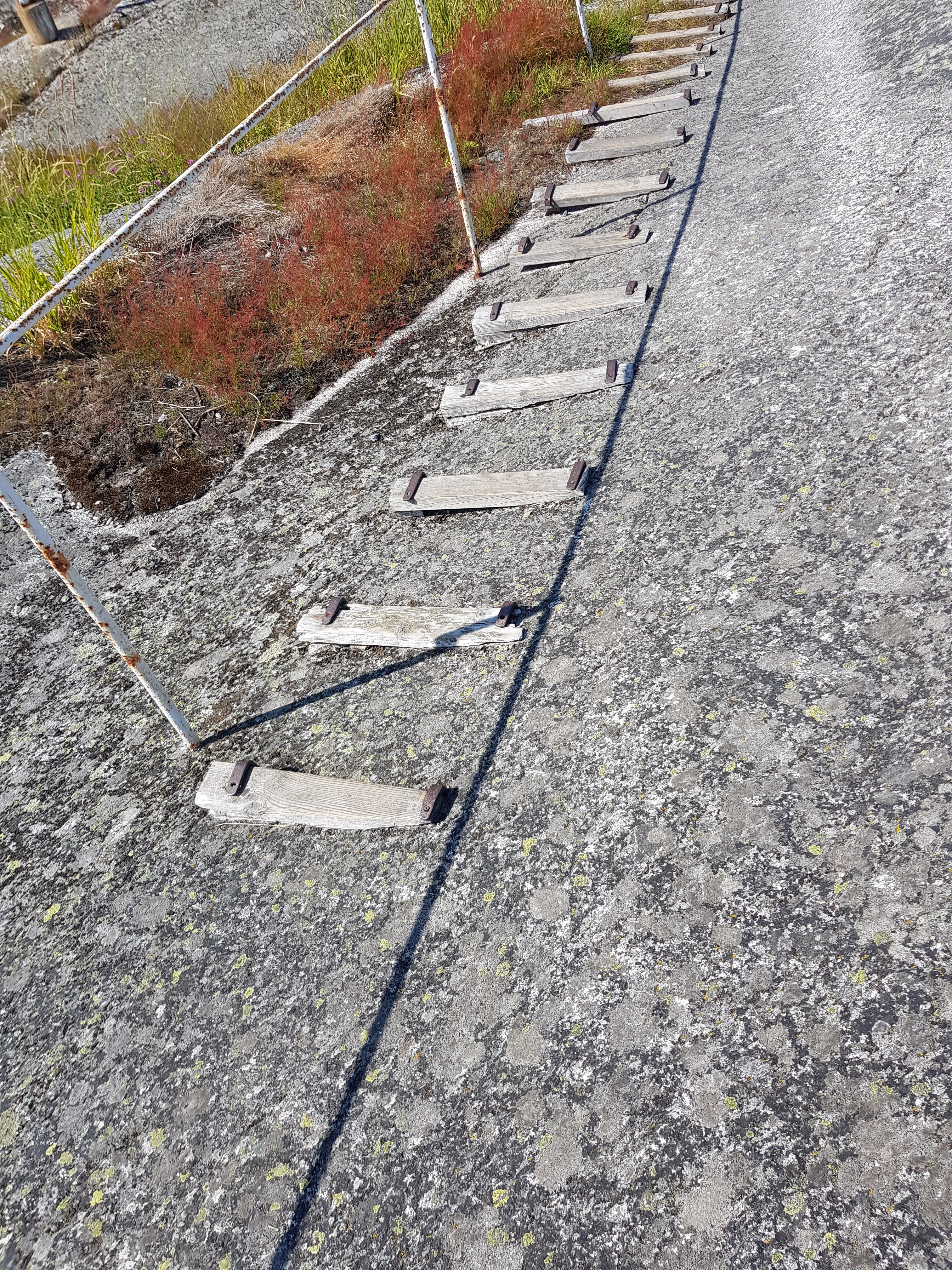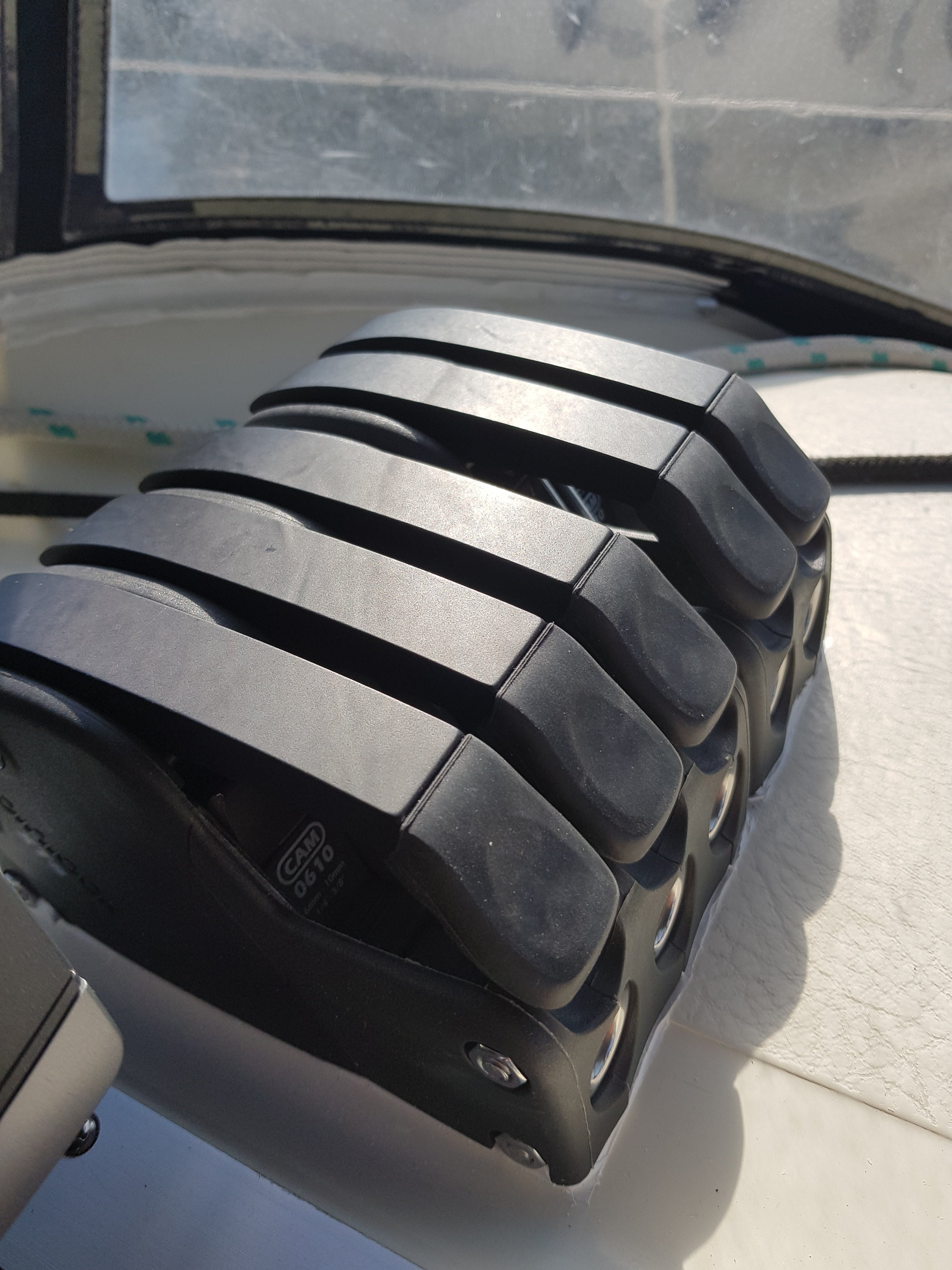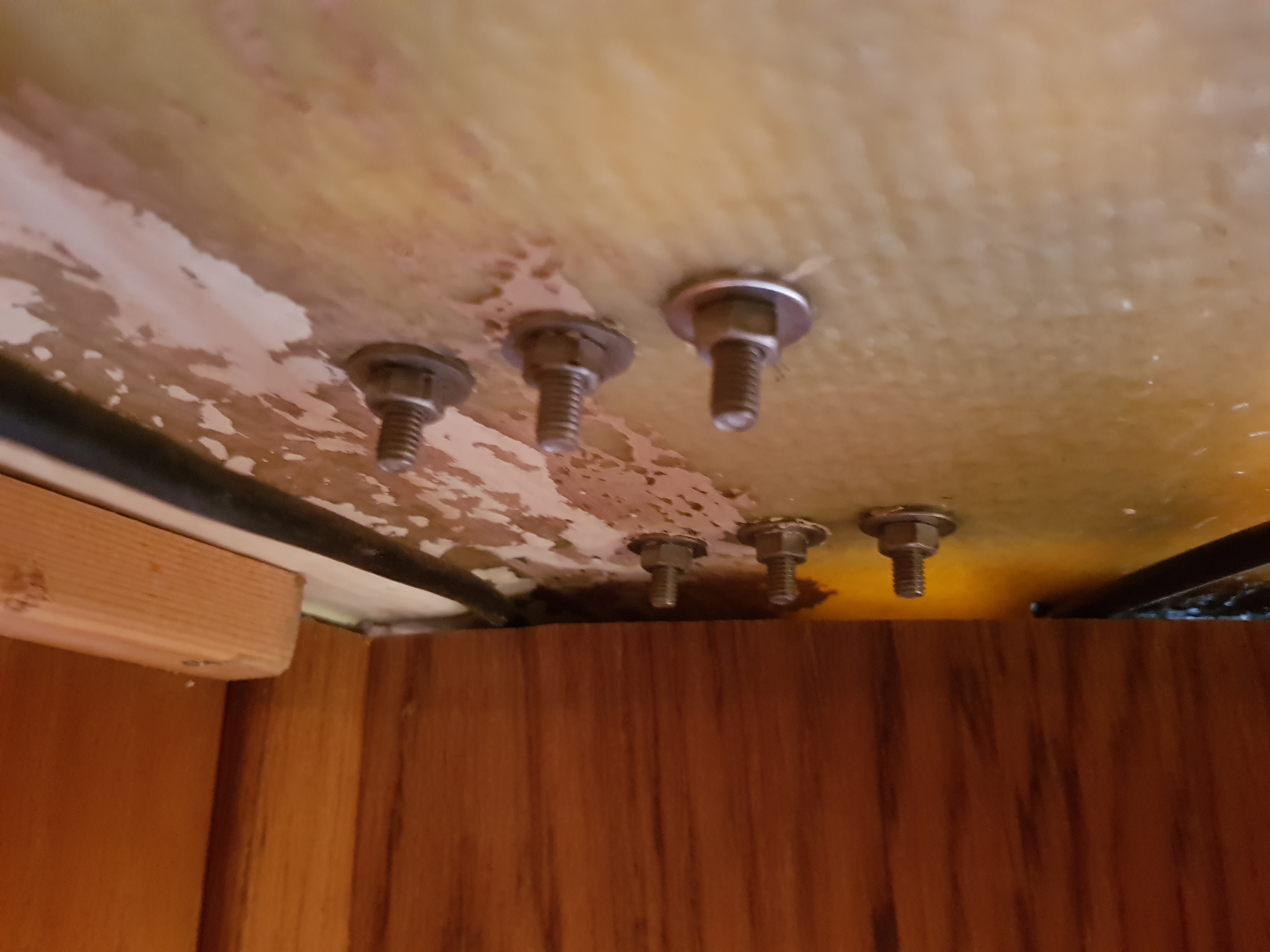 Efter morgonjoggen och bunkring på ”stan” var det dags att ge sig i kast med skruvandet. Lyckligtvis finns det gott om plats under innertaket på toaletten, dock inte hur mycket som helst. Mina 50mm M8 som kändes korta i butiken var lite för långa. Taket är nån dryg centimeter tjockt och helt homogent. Gamla hålen passade förstås inte alls utan fylldes med epoxy. Nya avlastarna täcker i alla fall över hålen.