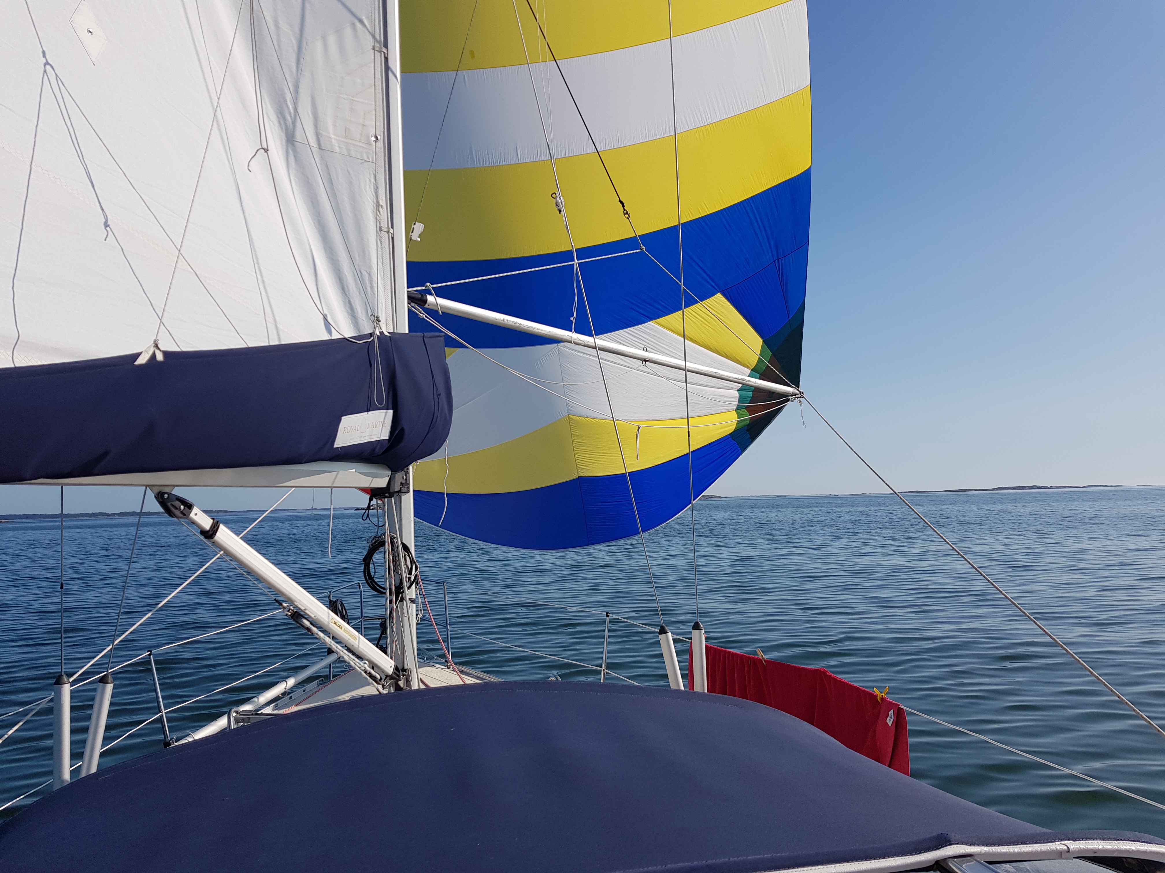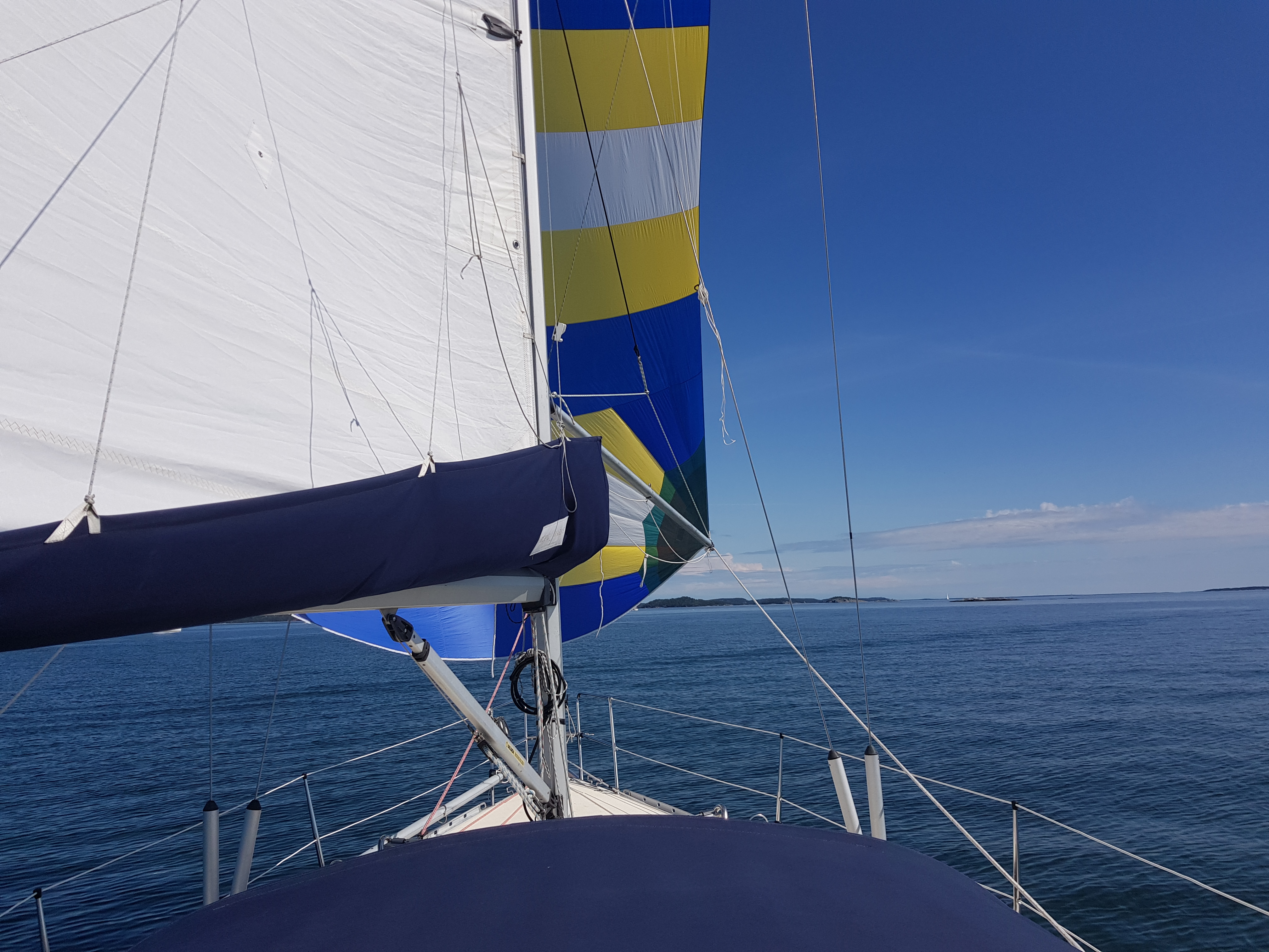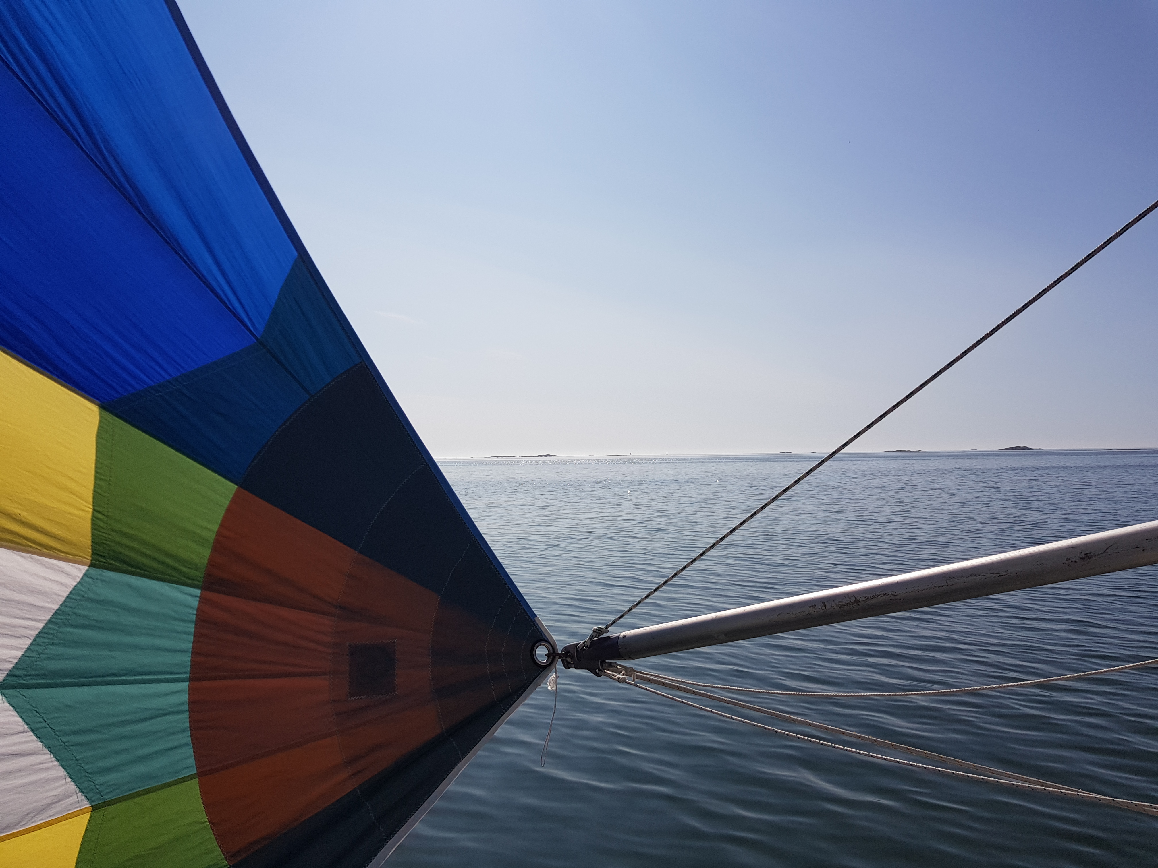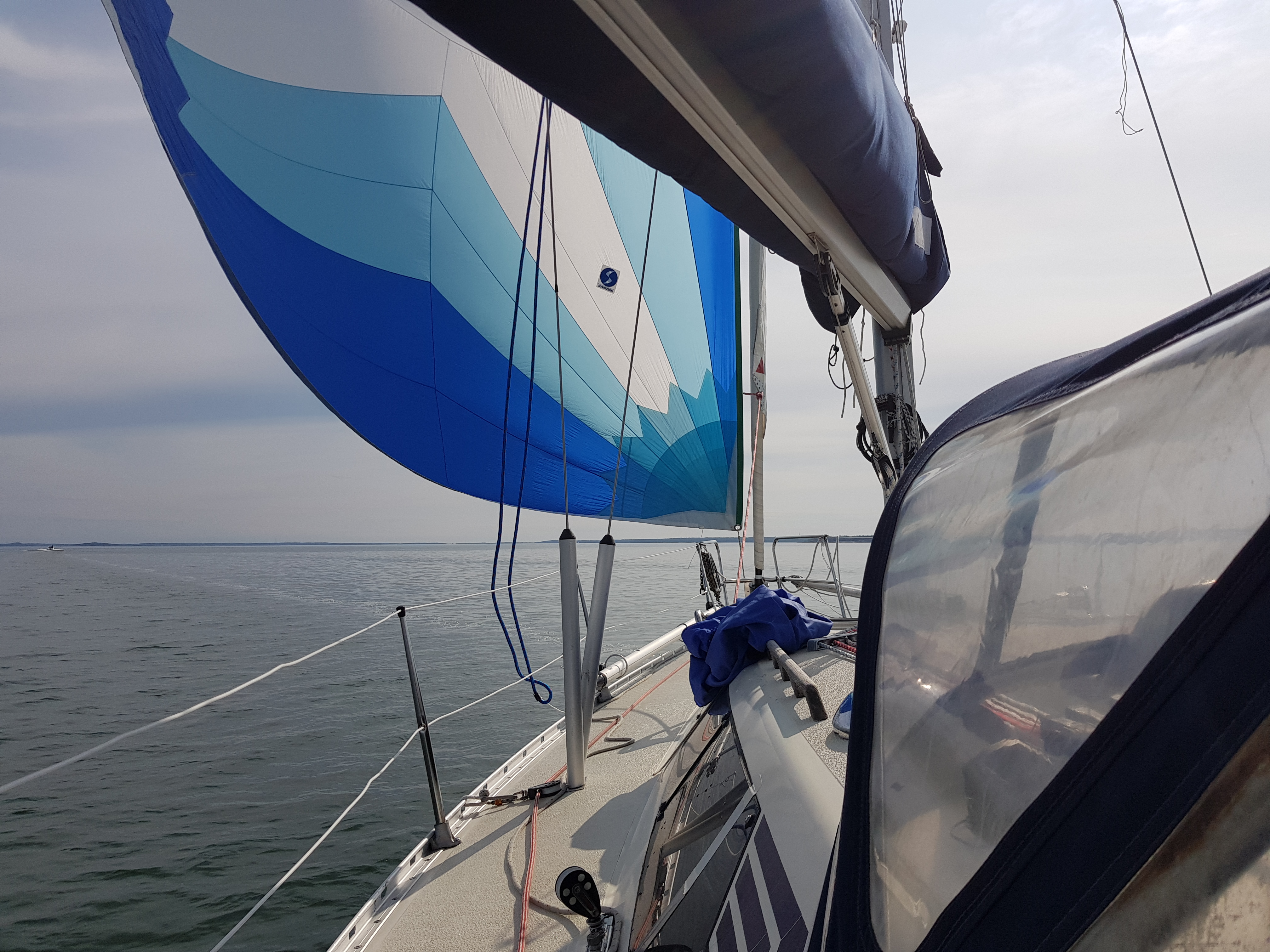 Hade det inte varit för att vi tog en sväng förbi Septikonen som låg i viken skulle det varit läge att lyfta upp ankare och sätta segel direkt… Vi seglade ur viken och satte spinnaker direkt. Den satt hela vägen till Hallskär och vi fick vikens kanske bästa plats. Det är få båtar på fjärderna som sätter undanvindssegel så man känner sig snabb även om första halvan av resan höll sig runt 3 knop sådär och den andra över 5 i alla fall långa stunder.
