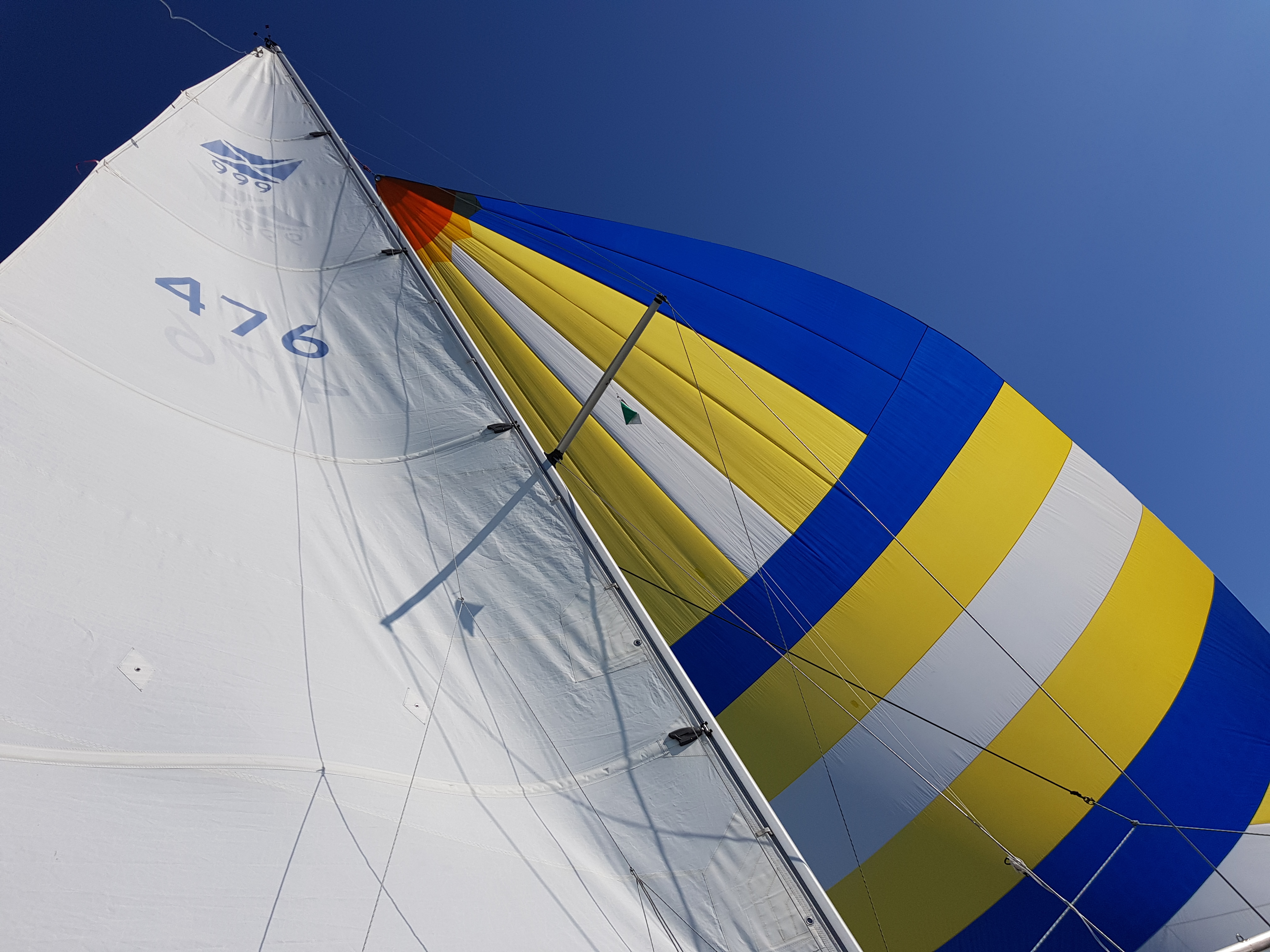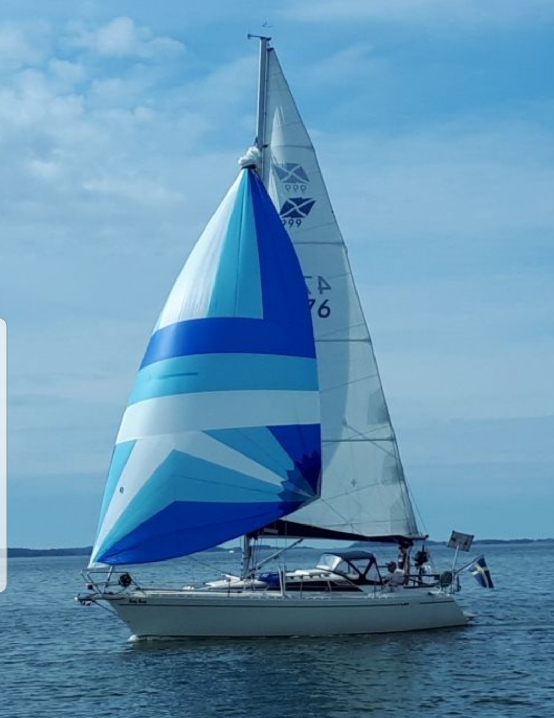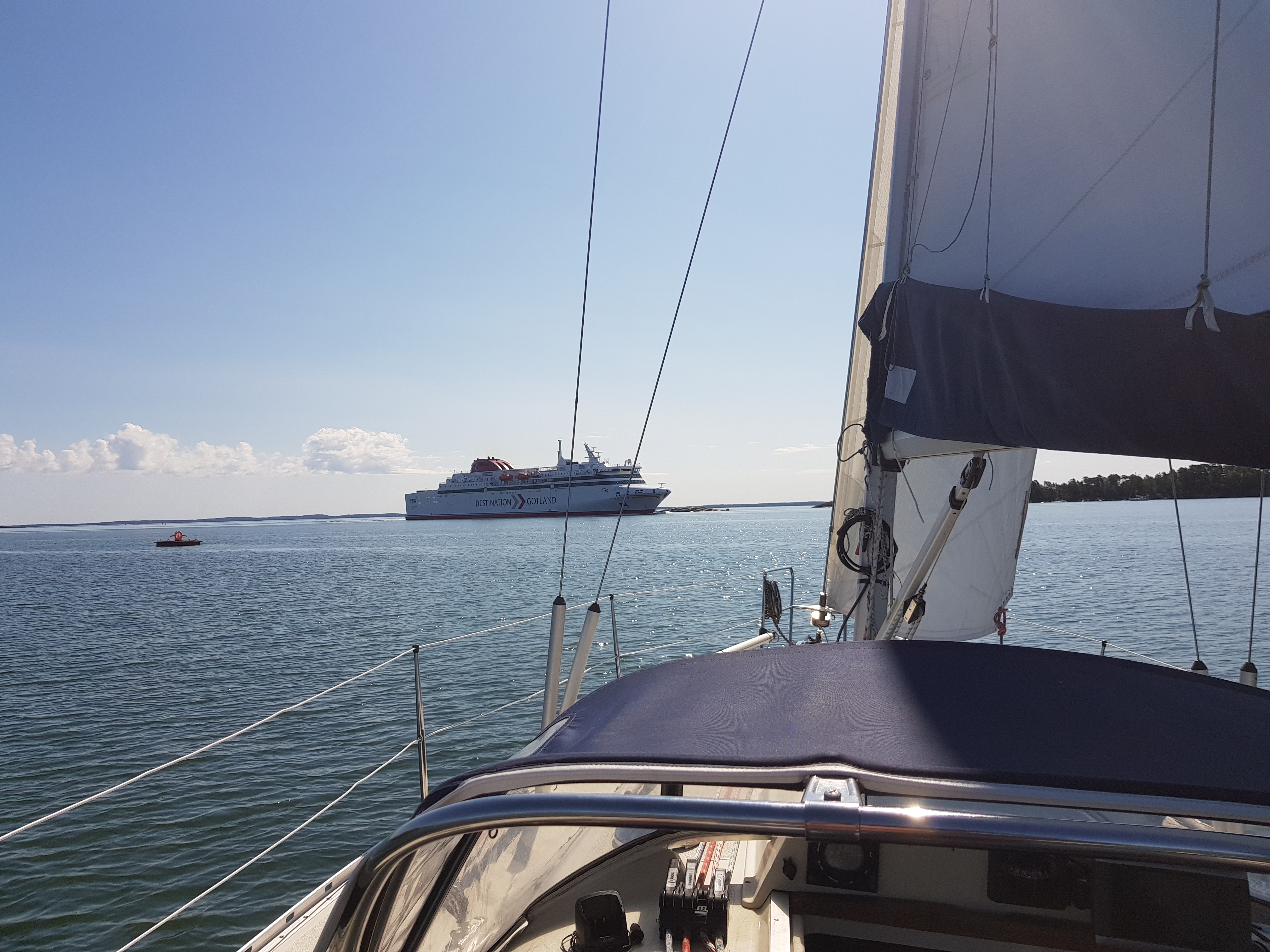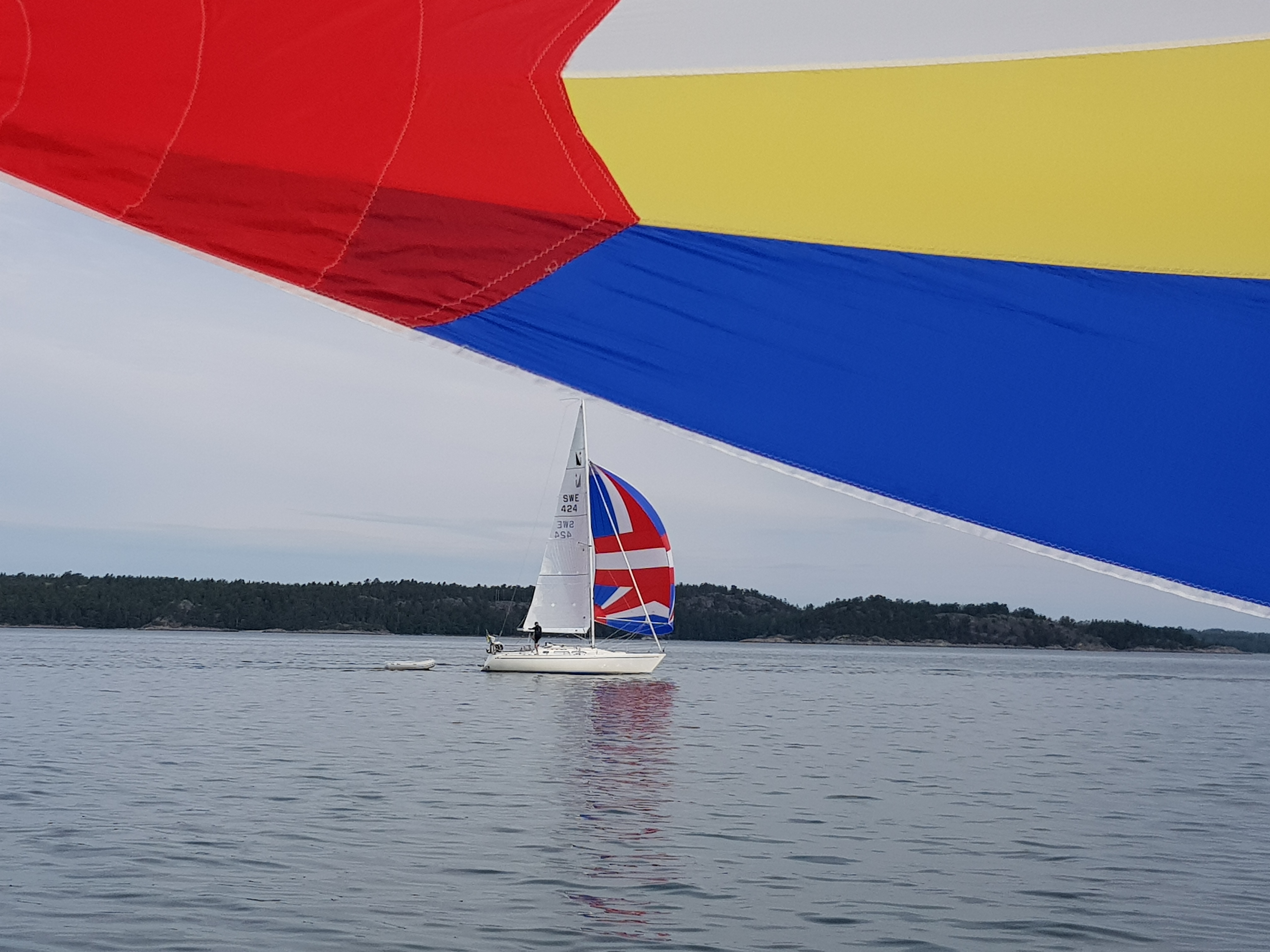 Hade det inte varit för att vi tog en sväng förbi Septikonen som låg i viken skulle det varit läge att lyfta upp ankare och sätta segel direkt… Vi seglade ur viken och satte spinnaker direkt. Den satt hela vägen till Hallskär och vi fick vikens kanske bästa plats. Det är få båtar på fjärderna som sätter undanvindssegel så man känner sig snabb även om första halvan av resan höll sig runt 3 knop sådär och den andra över 5 i alla fall långa stunder.