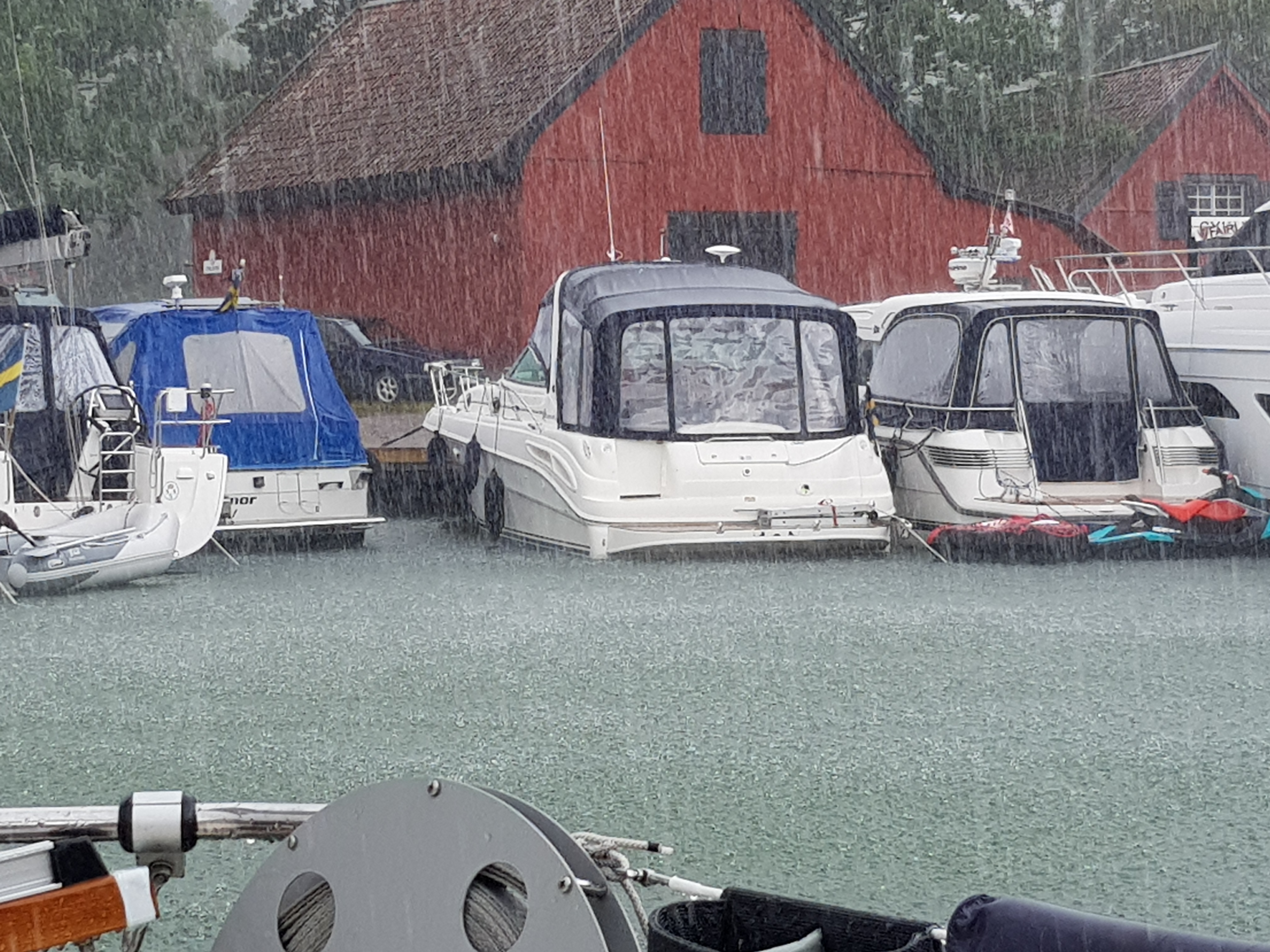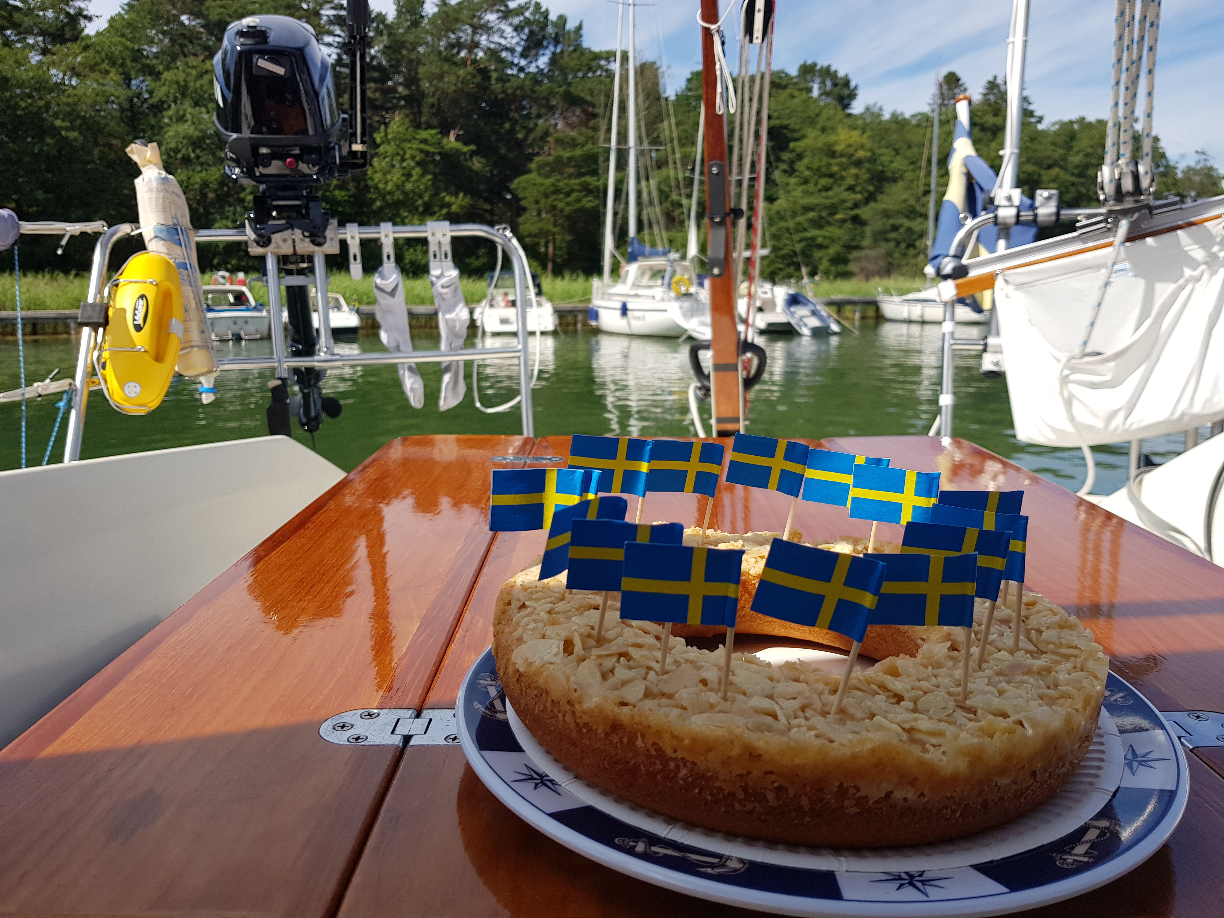 Riktigt svaga vindar. Utlovade sydvästen på mysingen uteblev. Först åkte gennakern upp men byttes snabbt mot spinnaker. Tyvärr lättade det ut ännu mer och med 3 sjömil kvar till Utö var det bara att ge upp. Som vanligt fullt pådrag med båtar när man ska lägga till. Alla på en gång, det går snabbast då.. Inga ankartrassel och vi kunde smita in på en plats hyfsat långt in när, vad vi tror i alla fall, Peter Magnusson lämnade med sin Targa. Efter lunch kom det utlovade regnet. Tjejerna bakade blåbärspaj av blåbären som plockades igår, alltid smaskigt! Troligen blir vi kvar här några dagar. Imorgon ansluter lite kompletterande besättning till kompisbåt och kompisbåt två vänder stäven hemåt. Innan dom gör det hoppas vi få fira vårat födelsedagsbarn.