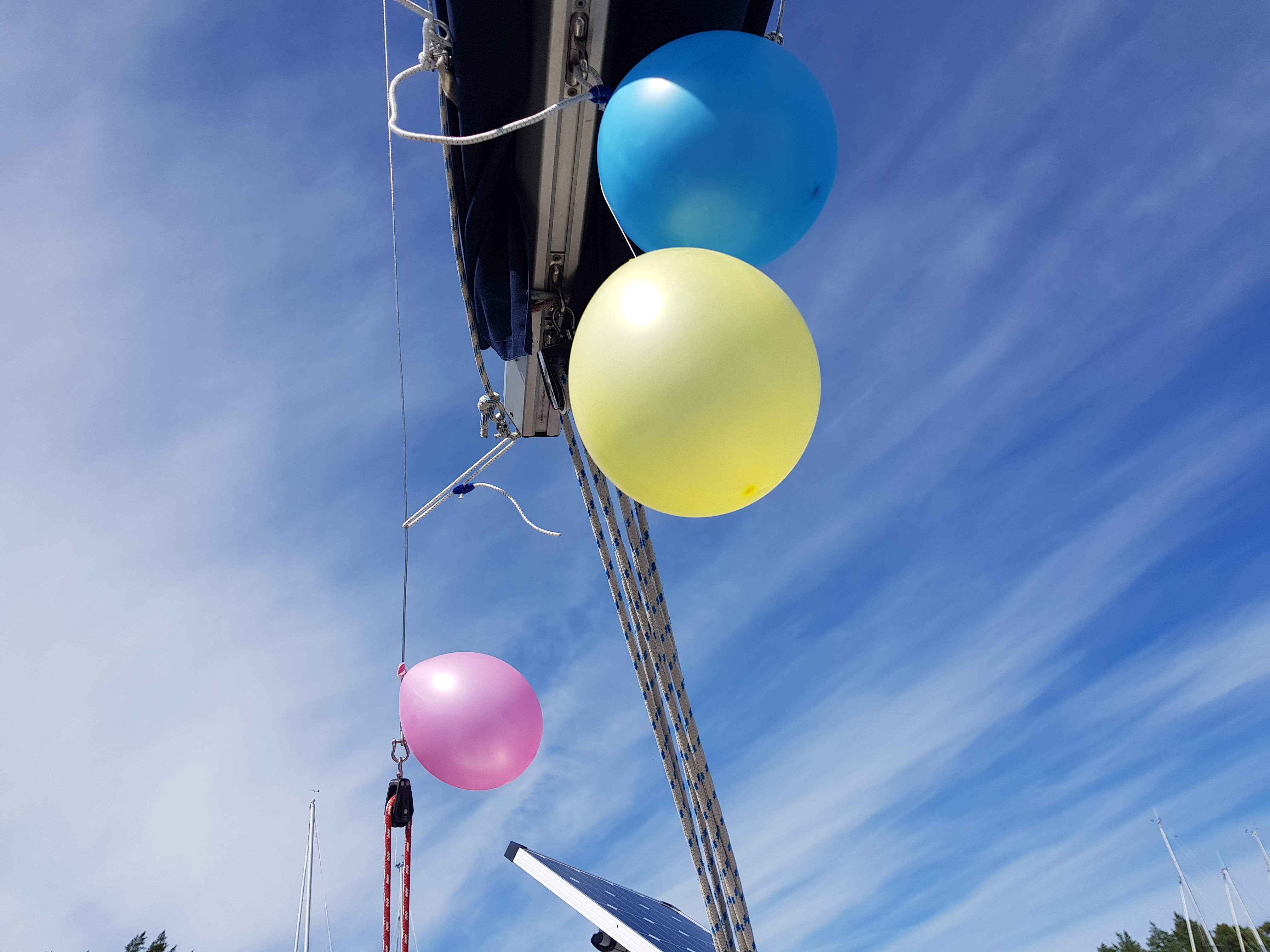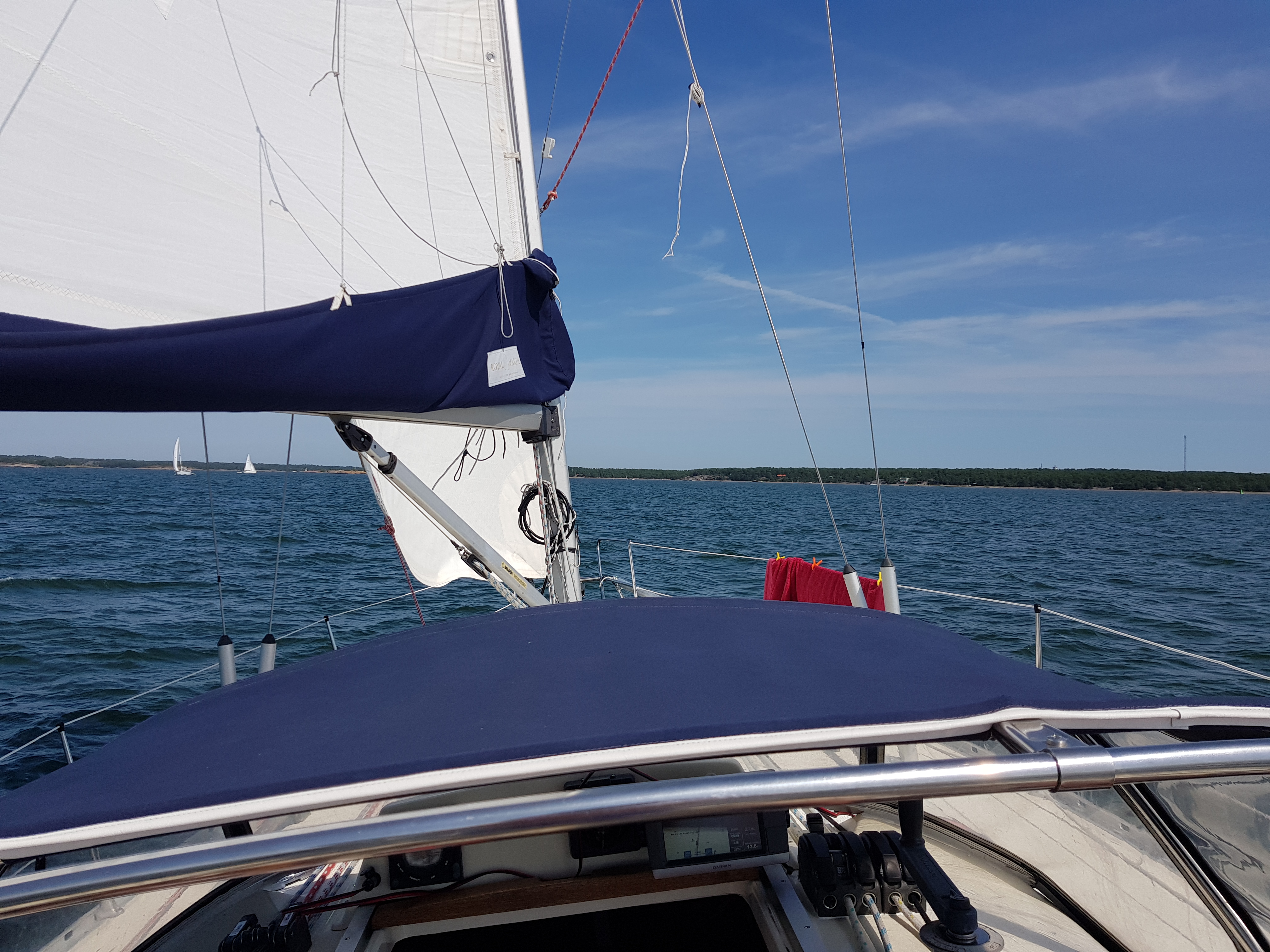 Färdiga resultatet. Längst ut på styrbord nöter linan i uttaget under sprayhooden, där har jag bomliften så det får funka tills vidare.
