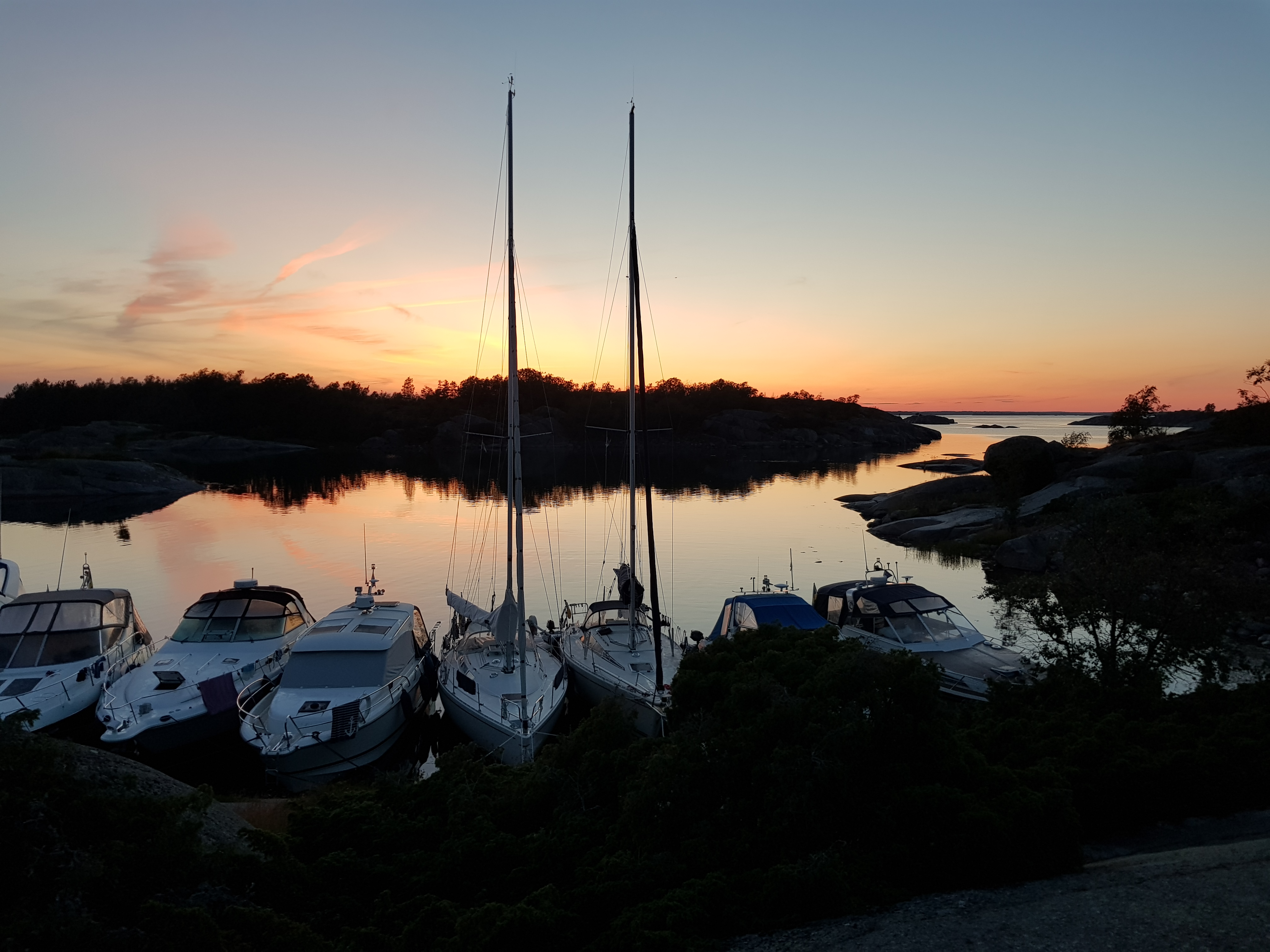 Lämnade Utö i ottan och havet låg helt spegelblankt. Omöjligt att segla idag. Strax innan Huvudskär körde vi rakt in i dimman. En läcker inramning och härlig mystik när dimman lättade lagom till att vi kom fram. Det är fantastiskt fint vilket man inte är ensam om att vilja upptäcka. Det kryllar av båtar.. sedvanlig sillunch och upptäcktsfärd sen grillning och solnedgång.