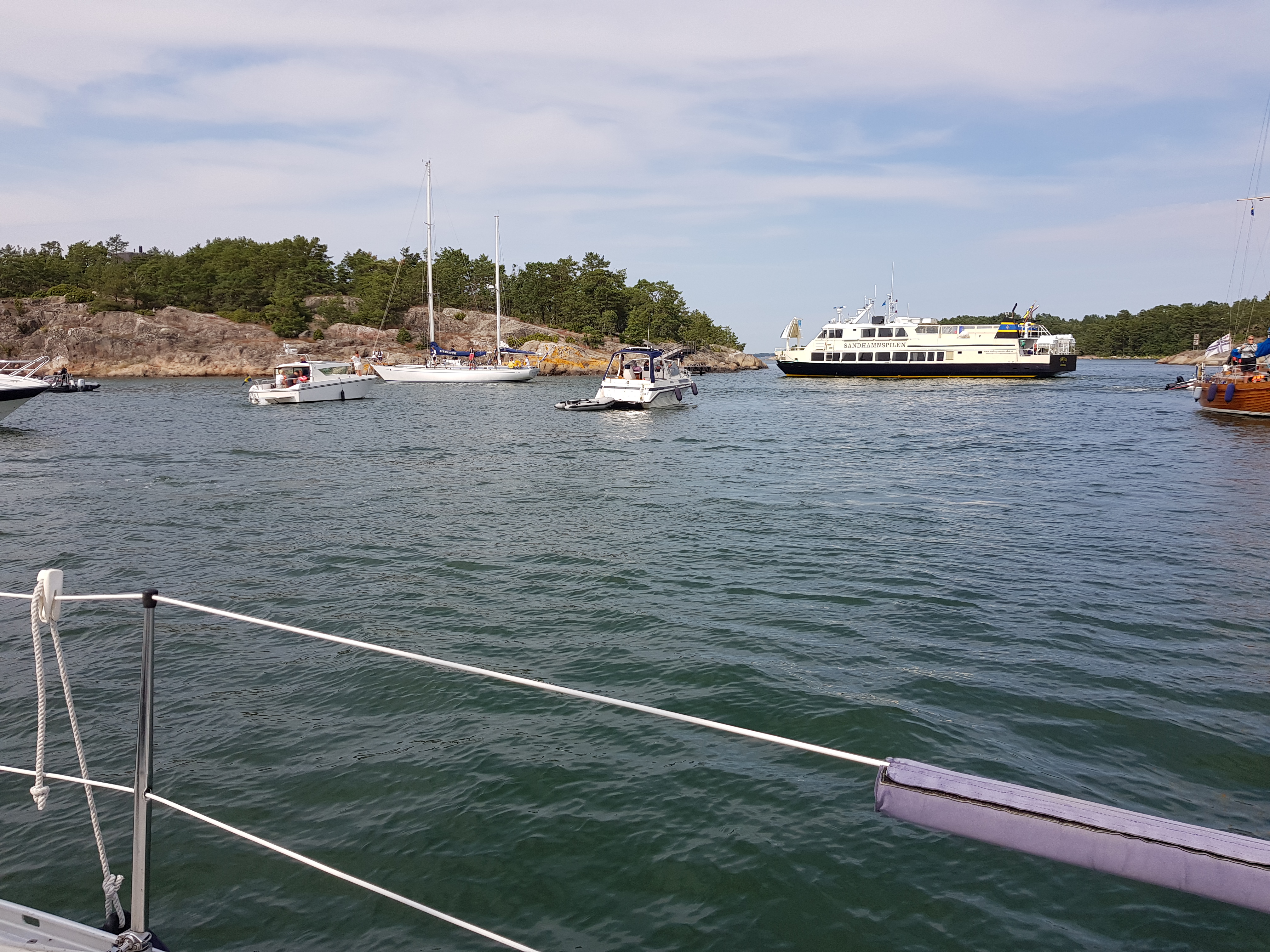Hallskär fortsätter att ankartrassla. Sist vi var här fick vi kompisens ankarlina runt propellern, nu trasslade jag bara med ankare.. Lite av ett styrkepass att lyfta ett extra 10-15 kg plus kätting. Gick bra till slut och fick en jättefin halvvind till Sandhamn. Där är det ett elände. Hur mycket båtar som helst och hopplöst eländigt att få en plats. Är man stor och flådig motorbåt så är det fullservice. Som liten familjeseglare är man ointressant. Fick snurra i fem timmar innan man behagade förbarma sig över oss. Fin ö men gästhamnen lämnar mycket övrigt att önska. Väl inne åt vi extremt oprisvärda pizzor. Hade kunnat äta bark och tyckt det var gott. Nåja, promenad, tvätt och handling. Pulsen går nog ner..