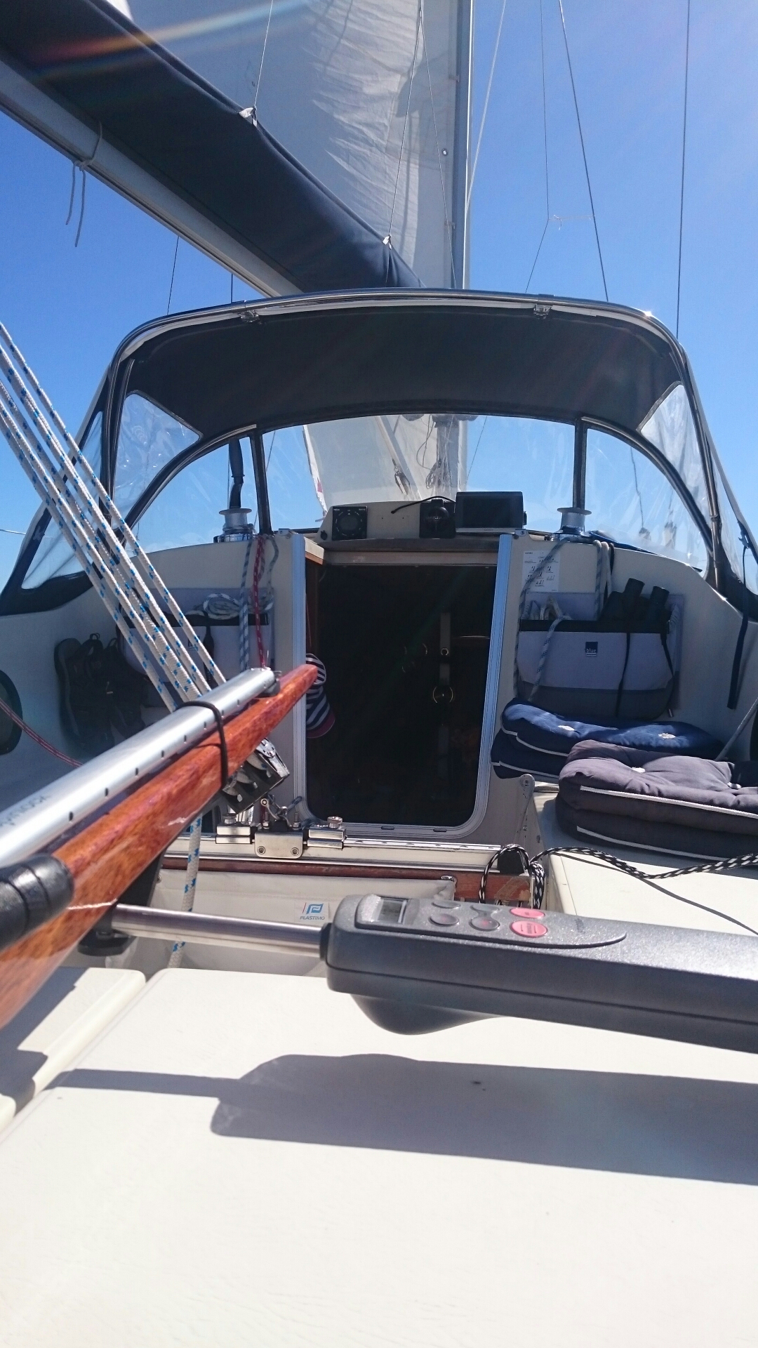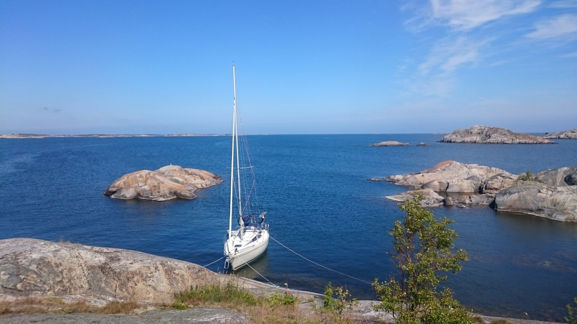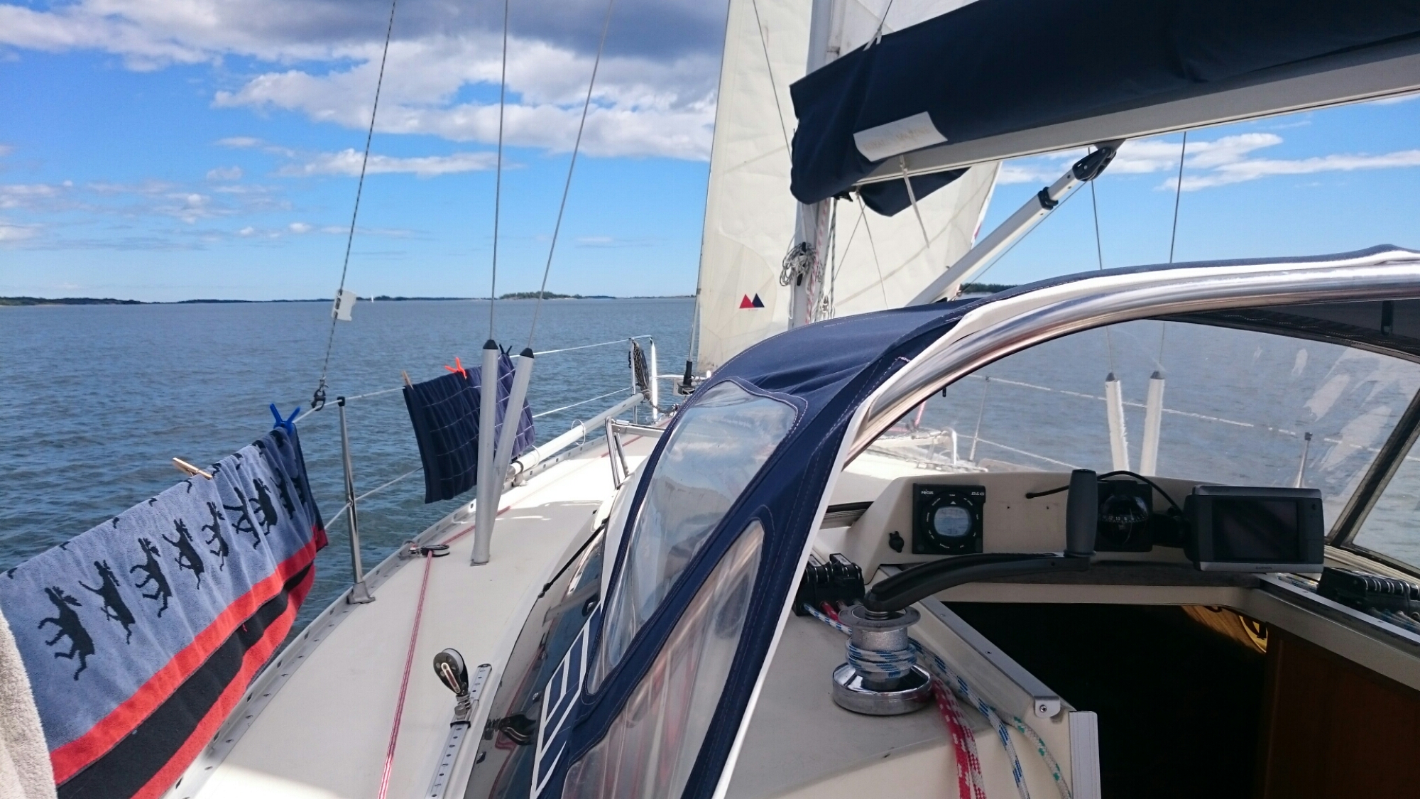 Dagen började som brukligt med blå himmel. Lite orosmoln förstås att inte ha någon gas men vi passade på att smita tidigt medan det fortfarande var relativt lugnt. Dessutom lyckades jag gå på grund trots att jag lånat Puttes hydrographica-special. Jag vill påstå att det var vitvatten, om än nära det blå… Ingen fara, farten var ca 1 knop och det skramlade till lite så var vi förbi.