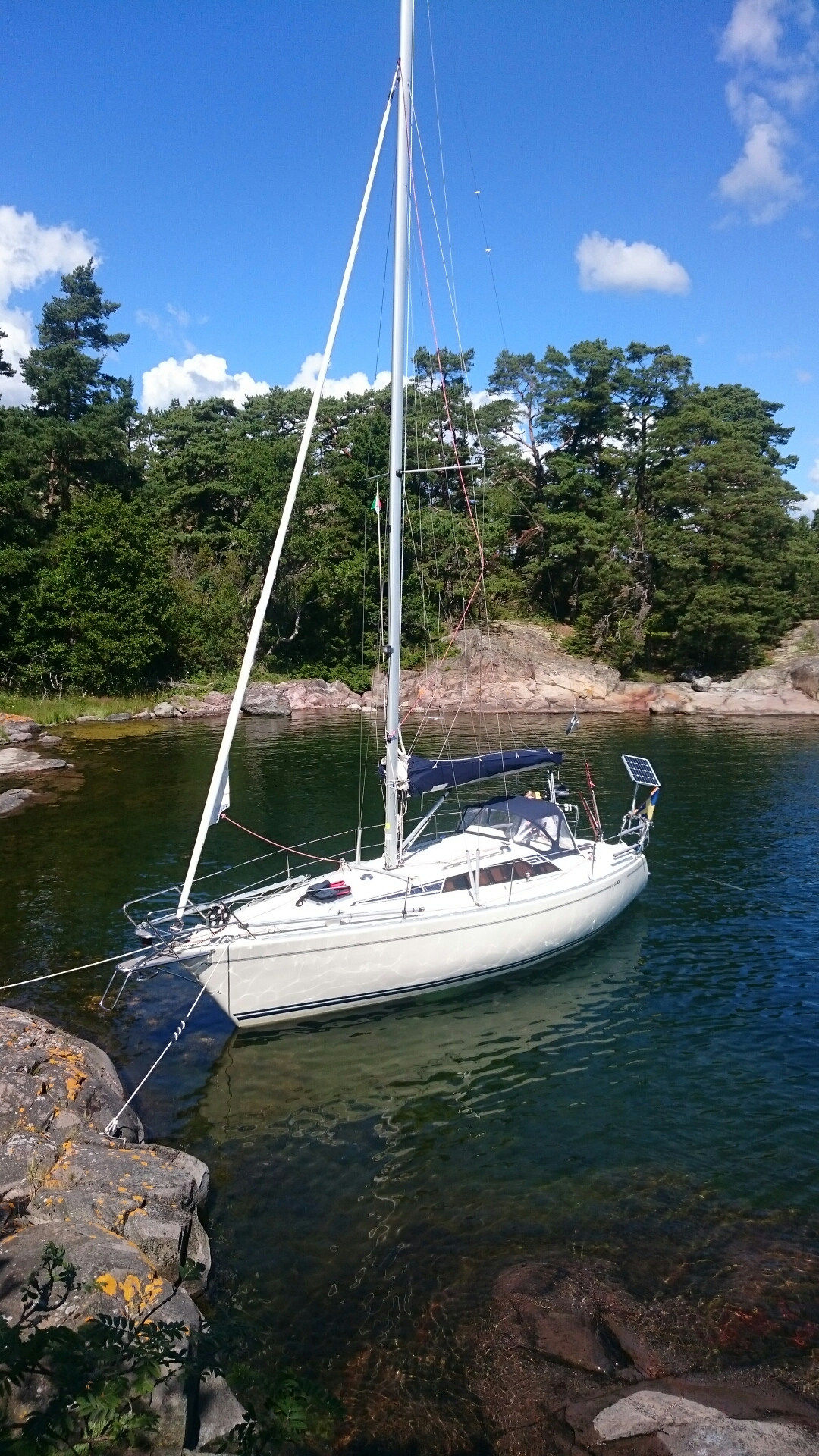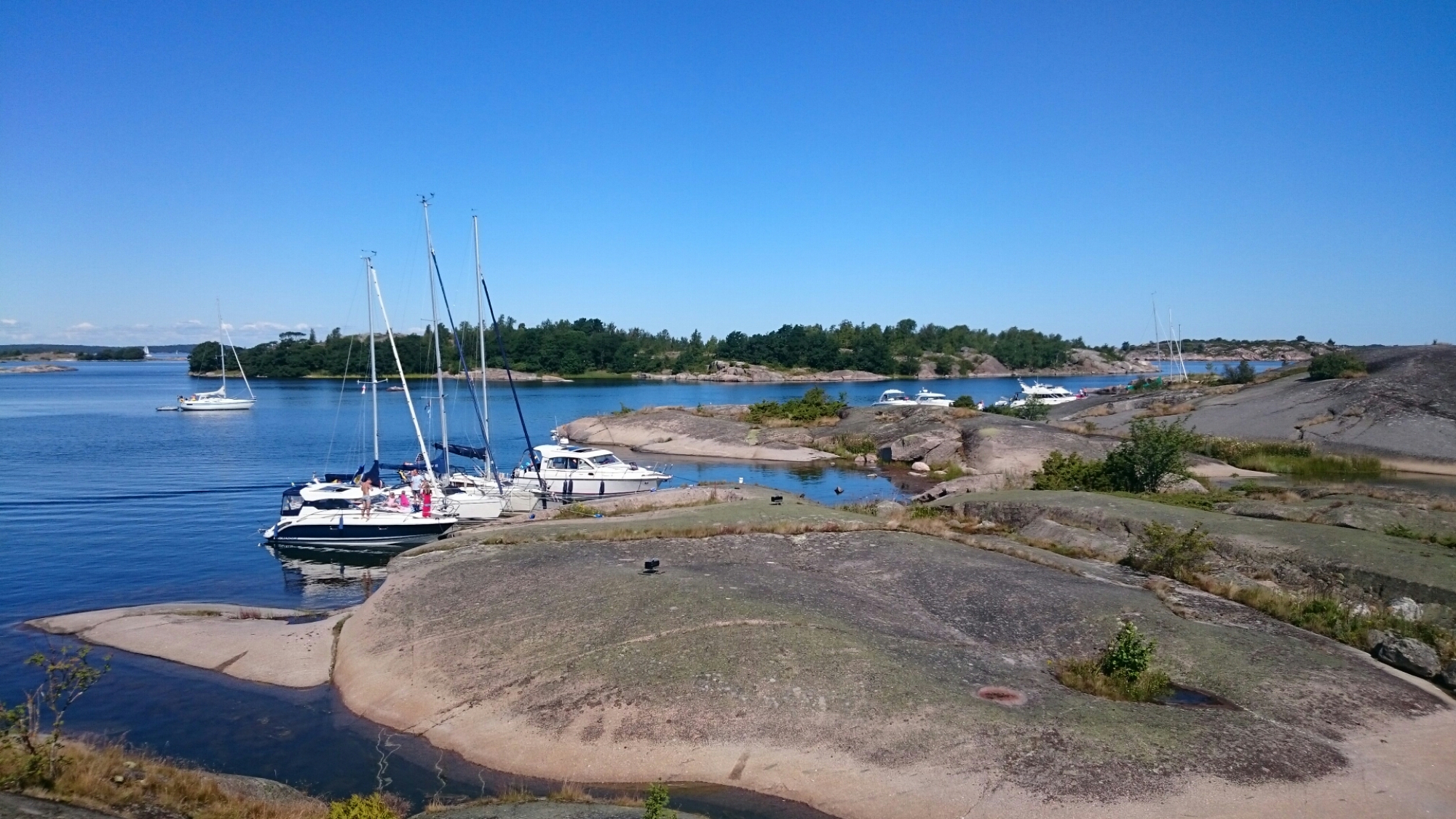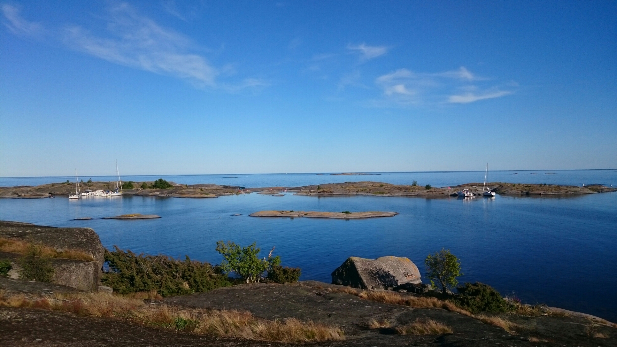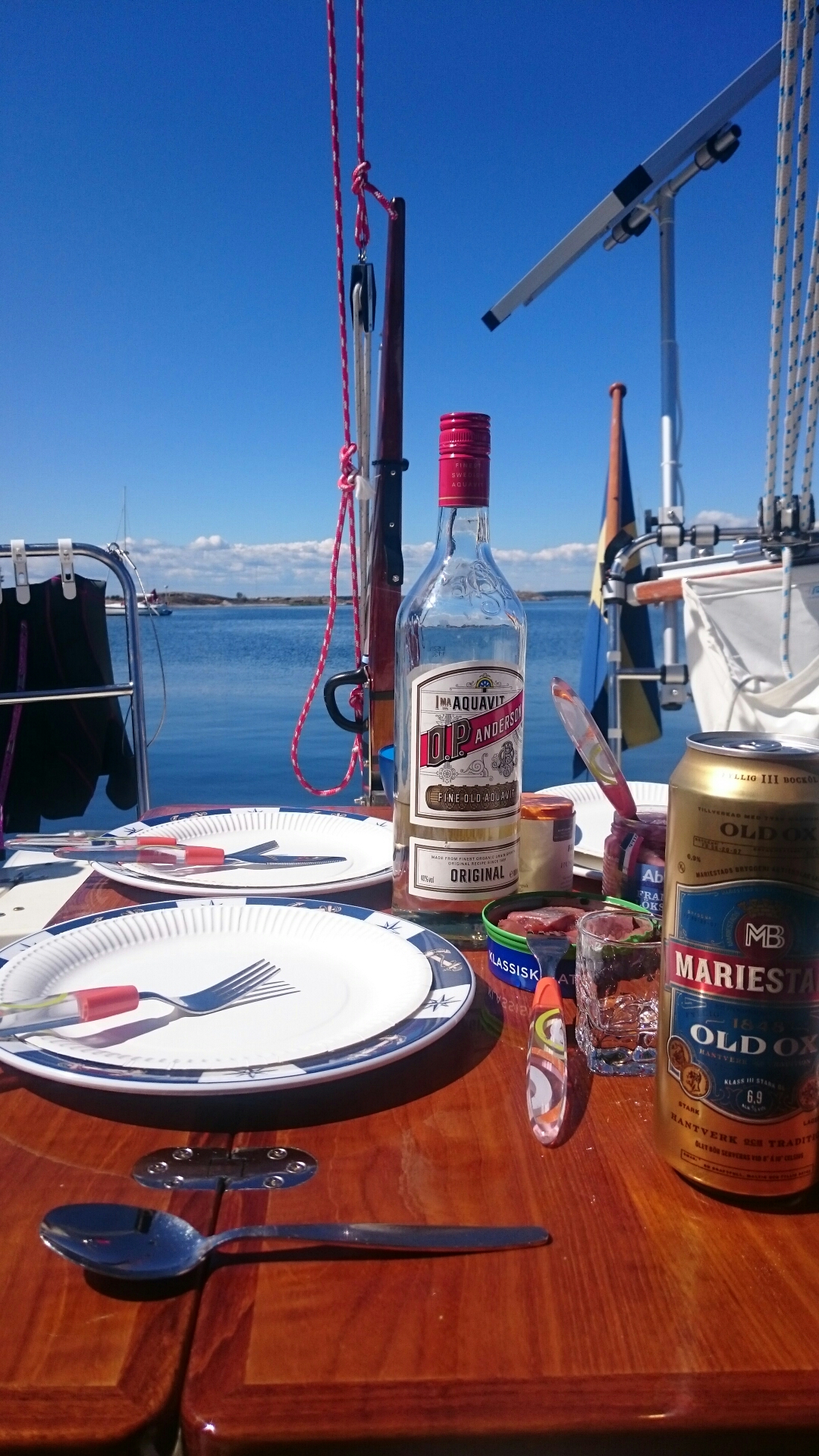 Dagen började som brukligt med blå himmel. Lite orosmoln förstås att inte ha någon gas men vi passade på att smita tidigt medan det fortfarande var relativt lugnt. Dessutom lyckades jag gå på grund trots att jag lånat Puttes hydrographica-special. Jag vill påstå att det var vitvatten, om än nära det blå… Ingen fara, farten var ca 1 knop och det skramlade till lite så var vi förbi.